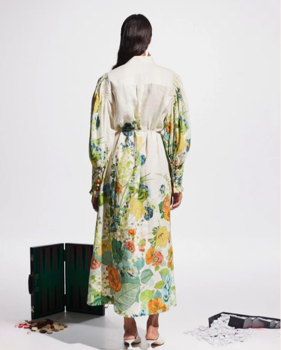 Featuring a relaxed shirtdress silhouette with a stand collar and balloon sleeves, this piece is crafted from 100% european linen. The self-tie rouleau belt and in-seam pockets add functionality to this elegant piece.