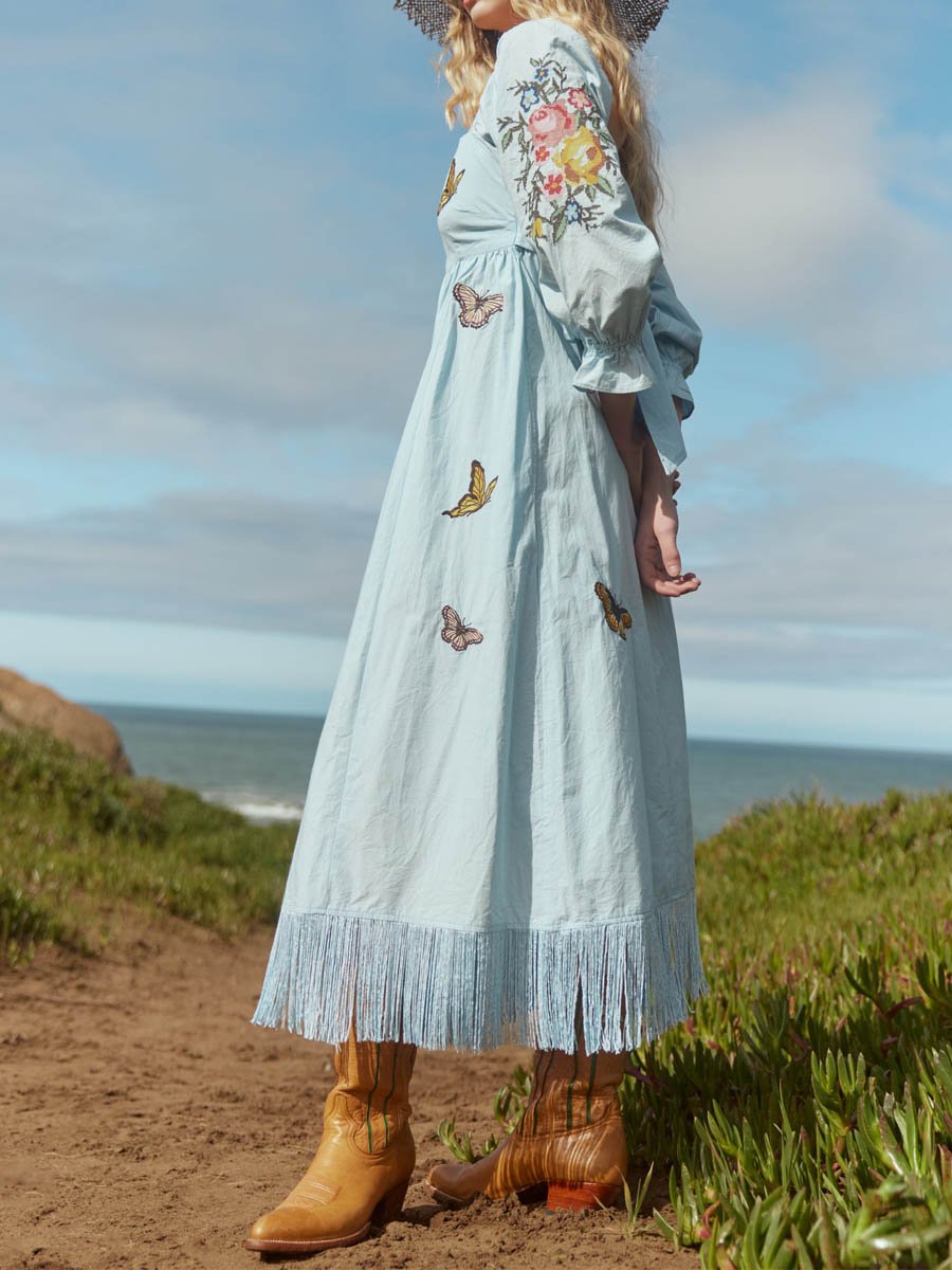 Crafted from a linen blend, this dress accented with clear blue skies colored fringe at the hem. Romantic puff sleeves designed to be worn on or off the shoulder, adorned with cross-stitch floral on the center sleeve and finished with a romantic ruffle. Elasticized back and adjustable tie provide support. Hand-placed embroidered butterflies dance on this empire waisted silhouette