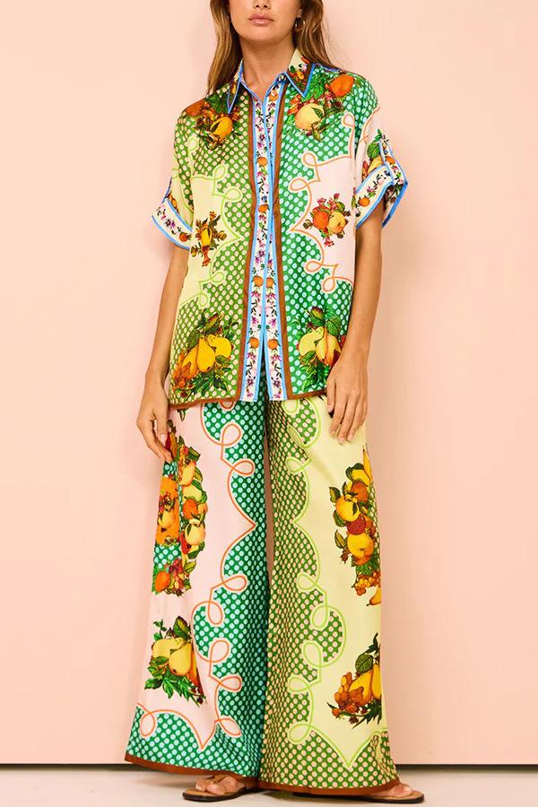 Cut from glossy silk-twill in a wide shape, these 'Lemonis' sets are decorated with an abundance of fruit and contrasting polka-dots. Wear yours with the coordinating shirt and playful earrings.