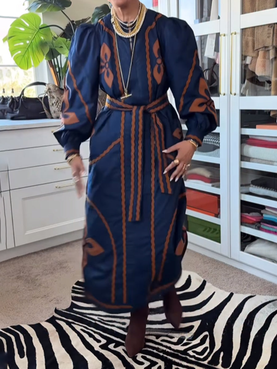 Placement Print Belted Long Sleeve Dress