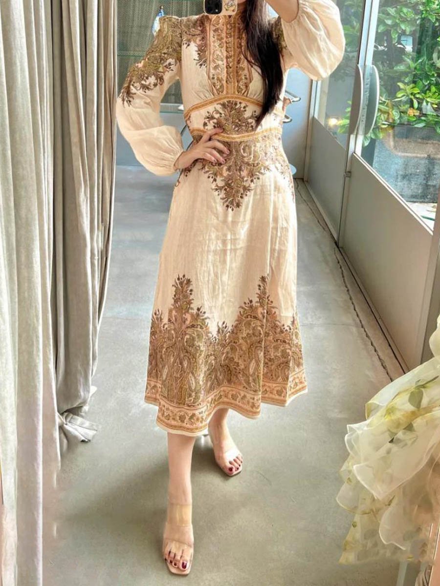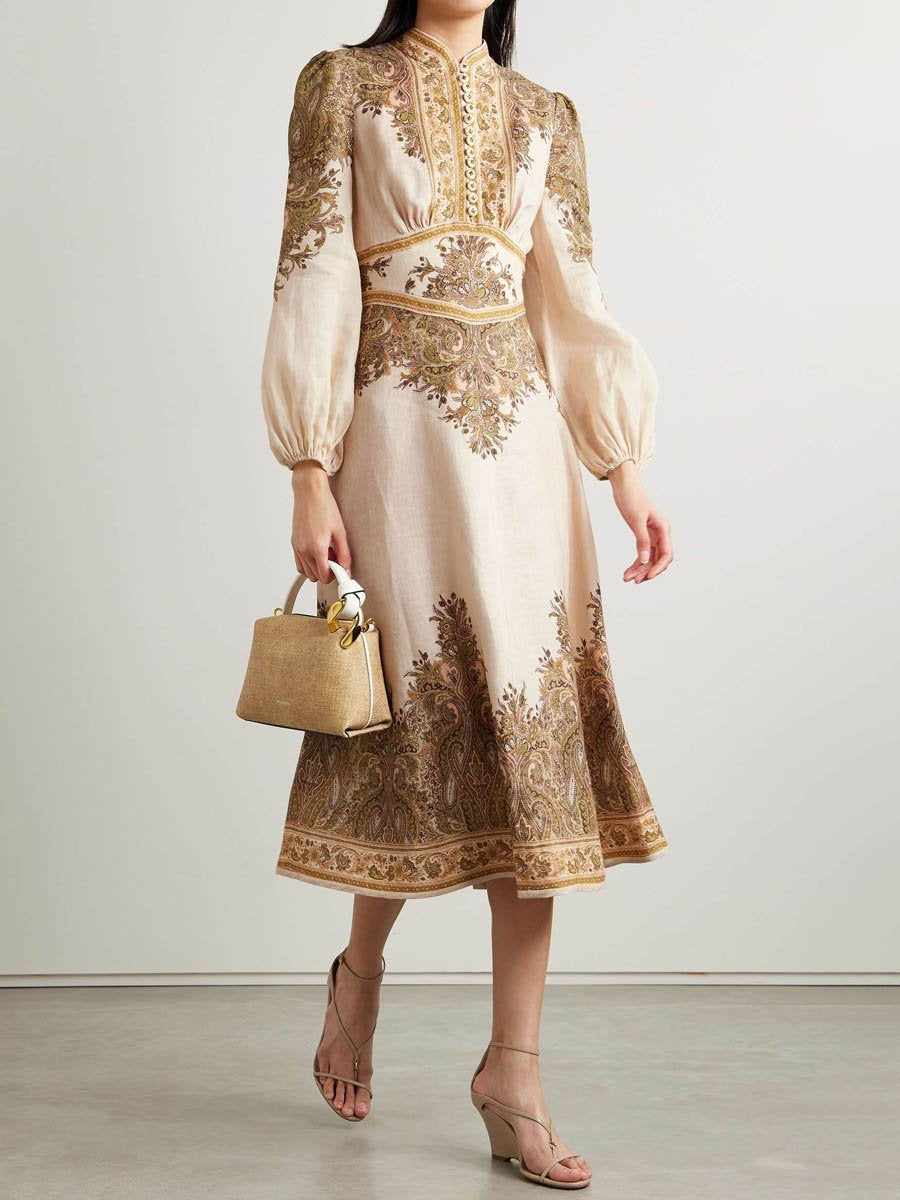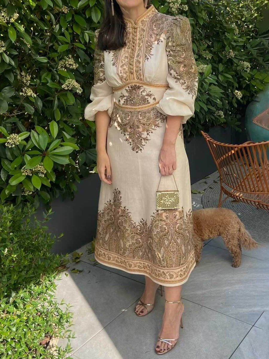 Take on the day with confidence in our Single-breasted Placement Print Midi Dress! Made of luxurious linen, this elegant dress boasts a stand collar and voluminous sleeves, adding a touch of boldness to your wardrobe. With functional buttons and elastic cuffs, and a relaxed skirt for maximum comfort. Don't miss out on this adventurous addition to your closet.